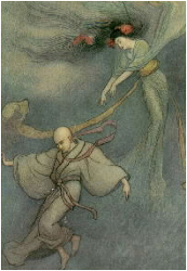 – Ez az! Most kell a lányt kiszabadítani! – futottak oda az emberek. Sietve kiengedték a leányt a dézsából, s levették róla a kimonót. Kerestek gyorsan néhány jókora követ, amelyek a leány súlyát kiadták, ezeket belerakták a dézsába, rájuk terítették a levetett ruhát, a lányra meg egy másikat adtak, s szaporán visszasiettek a falujukba.