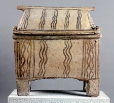 Négy lábon álló hosszúkás, szabálytalan négyszögletes testű terrakotta koporsó, ún. larnax.