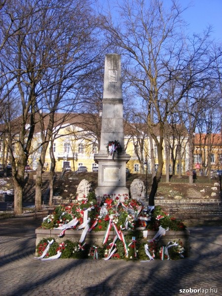 évfordulójára állították Sepsiszentgyörgy főterén, az elhunyt hősök, honvédek emlékére. A középen emelkedő obeliszk fő oldalán a koronás magyar címer plakettje állt, lentebb pedig a harci szereket ábrázoló dombormű. Az oldallapokra Jókai Mór fogalmazta meg a következő feliratokat: ‘Az 1848-49 évi szabadságharcban Háromszéken és Háromszékről elesett honvédek emlékére’ (északi oldal), ‘A népjog és az önálló Haza vértanúinak emelé ezen szobrot emlékül a hálás utókor’ (nyugati oldal), ‘Ők a szabadságért és hazáért estek el, s él örök emlékük, míg él magyar, él a szabadság’ (déli oldal). Az obeliszk két oldalán egy-egy carrarai márványból faragott oroszlánszobrot helyeztek el. Az egyik oroszlán éberen figyel, utalva a reakció hatalmával büszkén dacoló nemzeti győzelmekre, a másik meg alszik, utalva a szabadságharc szomorú végére.