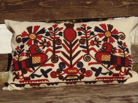 párnavégek és abroszok egyik jellemző motívuma, egy párnavég közepén három fér el belőle rendesen. A „pápaszemes” mintát a virágtő két szárának begörbített végével formálják oly módon, hogy abba helyezik el a rozettát. De illeszthetik a virágtövet igen mély öblű hullámindába is, melyet leveles ágból formáltak. Nemegyszer szegletesre formálják a rozettát vagy a gránátalmát, a közepét berácsozzák s a hozzáillő levélsorokat is szegletesen helyezik el mintegy mértani alakzatokba tömörítve. Igen gyakori – kiváltképp párnavégeken – az a középtengelyes minta, melynek alsó felső oldalán sugarasan elrendezett szárakon vannak a többé vagy kevésbé hosszúkás virágok. A dús mintákkal nagy vászonfelületeket borítanak be, a minta tömöttségét, zsúfoltságát még vízben sulykolással is fokozzák: a víztől és sulykolástól a vászon összemegy, fodrozódó felületet kap, és összerántja a hímzést is. A → kisírásos (láncöltéses) technikával varrt darabokon a minta lazább és rajzos hatású, a nagyírásosnál csak a szélesebb öltéssorok miatt is tömörebb és a motívumok szerkesztésmódja a természettől elvontabb. A tömörítés egyes daraboknál a minta teljes bezáródásáig megy, a hím beborítja az alapot. E munka kezdeteit nem ismerjük. Egyes példányok 1830-as datálással már kiérlelt mintákat, hibátlan technikát mutatnak be. Fel kell tételezni, hogy a szőttes, a szálánvarrott, a vagdalásos-laposöltéses technikák mellett az írásossal is éltek már a 18. sz.-ban, esetleg korábban is. Maga a nagyírásos technika más magyar csoportoknál csak kísérő öltésül jelentkezik. Európában a 12–13. sz.-tól ismerni előfordulását. A kalotaszegi hímzések jellegzetességei még a női ingek elején a ráncolások és azok mintás letűzése, főleg azonban a kötényeken és muszujokon levő darázsolások. Ezek a technikák sem ismeretlenek másutt, mégis ilyen megvalósításban, színesen, nemegyszer gyöngyösen csak ezen a vidéken készítették. A kalotaszegi hímzések motívumaik révén a régi stílushoz kapcsolódnak, a tömör, zsúfolt kivitelezés pedig már a parasztstílusok felé utal. – Irod. Malonyay Dezső: A magyar nép művészete (I., Bp., 1907); Bátky Zsigmond: Kalotaszegi varrottasok (Bp., 1924); Dajaszászyné Dietz Vilma–Palotay Gertrúd: Kalotaszegi keresztöltéses gallér és kézelőminták (Kolozsvár, 1942); Fél Edit: Ungarische Volksstickerei (Bp., 1961).