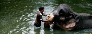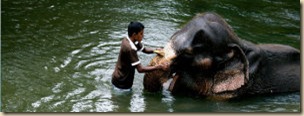 Mellette állt a gazdája, az ormányos hátát vakargatta egy éles szélű kókuszdióhéjjal, mintha csak borotválni akarta volna. Ceyloni kísérőnk elmagyarázta, hogy ezek szelíd, dolgozó elefántok. A környéken erdőirtás folyik, és az elefántok a levágott, láncra csatolt törzseket vízmosásokon vontatják le a völgybe. Ilyenkor déli szünetet tartanak, és a 40 fokos hőségben a hűvös patak vizébe húzódnak.