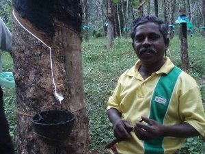 nem igazi erdők, hanem gumiültetvények voltak. A sorokba rendezett fákat emberkéz ültette. Törzsükből a jellegzetes csavarvonalban futó bevágások mentén tejszerű nedv folyt egy odadrótozott fél kókuszdióhéjba. Így fogják fel a nyersgumit, majd az ültetvény munkásai kannákba öntik.