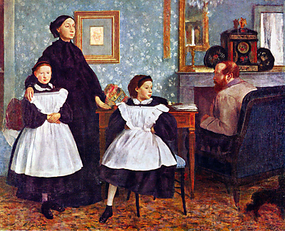 Degas-ra. A Bellelli család (1859-60) csoportképén festészete eddigi erényei mellett egy új vonás is jelentkezett, a kompozíció merészsége, illetve az a hallatlan természetesség és ésszerűség, melyet a kompozícióval elért, amikor a családfőt egy, a nézőnek háttal álló karosszékben oldalt fordulva festette meg. Mennyire más volt ez a természetesség látszatát keltő nézet, mint a kor szokásos portrébeállításai. A világos formák, tiszta vonalak, a természetes mozdulat és komponálatlanság látszatát keltő kompozíció, amelyek a képét jellemzik, ettől kezdve mindvégig Degas művészetének jellemző vonásai maradtak.