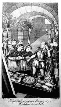 A XIX. század elején készült az alábbi illusztráció, amely azt az eseményt jeleníti meg, amikor a Pécsre látogató Mátyás királynak a papok megmutatták Janus Pannoniusnak az altemplomban rejtegetett, temetetlen holttestét. Ekkor, a kép alá írtak szerint, „Kigördült a szánás könnye a jó Fejdelem szemeiből.”