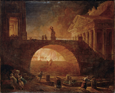A tűzvész kitörésekor Néró nem is volt a városban: szülővárosában, Antiumban, a mai Anzioban időzött. A hírre a fővárosba sietett, és – mint elsőként Cassius Dio beszámolt róla – kitharáját pengetve gyönyörködött a pusztulásban. (Megjegyzendő, hogy Dio írása nem kevesebb mint másfél évszázaddal a katasztrófa után született.) Tacitus ugyanakkor azt is megírta, hogy Néró gondoskodott a fedél nélkül maradottakról, pénzt folyósított az újjáépítésre, tűzoltalmi rendeleteket hozott… keresztre feszítette a keresztényeket, és az üszkös romokon felépítette az Aranyházat.
