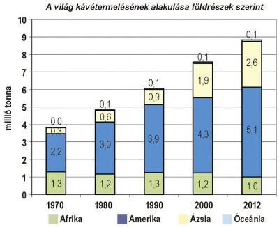 A déli országok a hetvenes évektől nagymértékben növelték a mezőgazdasági termékek exportját. Az elmúlt évtized közepéig a kávétermesztés a duplájára emelkedett. Ma több mint hetven ország termeszt kávét. Ázsia részaránya a világ termelésében szinte folyamatosan emelkedő volt, míg Afrika szerepe csökkent, miközben Latin-Amerika végig megőrizte vezető helyét. A kávé évi termelése 2012-ben megközelítette a 9 millió tonnát. A legnagyobb kávétermelő országok ma: Brazília, Vietnám, Indonézia és Kolumbia. Az összes termelés 58 százaléka származik Dél- és Közép-Amerikából, 30 százaléka Ázsiából, 11 százaléka Afrikából. Óceánia részesedése mindössze 1 százalék.