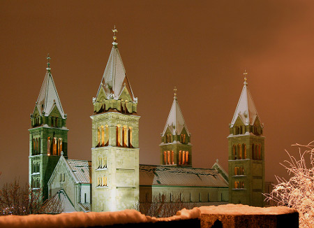 A gazdag ókeresztény múlttal rendelkező Pécsett 1009-ben alapított Szent István püspökséget. 1046-ban Péter királyt az általa építtetett székesegyházban temették el. Ez a Képes Krónika adata szerint 1064 húsvétján leégett, s valószínűleg csak a trónviszályok elülése után kezdhettek hozzá az újjáépítéshez. A mai, a XIX. században radikálisan átépített templom elrendezése már ebből a román kori épületből származik.