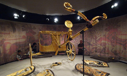 Tutanhamon fáraó sírkamrájába a temetés idején, I.e. 1322 körül temérdek más kincs mellett két pazarul díszített, aranyozott harci szekeret is elhelyeztek. Efféle, csak parádékon és egyéb jeles események alkalmával használt jármű csakis a legnagyobb méltóságoknak járt. Nem sokkal az után, hogy 1922-ben Howard Carter régész felfedezte a tizenévesen elhunyt uralkodó temetkezési helyét, a kairói Egyiptomi Múzeumban kiállították a két harci szekeret. A bőr alkatrészeket takaró, mívesen megmunkált aranylemezeket azonban nem hagyták a kocsikon: biztos, ami biztos, a raktár mélyére dugták.