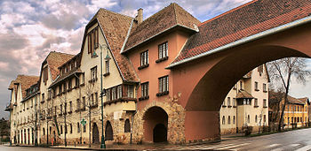 Kós Károly tér, a Wekerle-telep központja, a Kós Károly által tervezett két épületének egyike, valamint az Ady Endre út felé nyíló, szintén általa tervezett kapu.