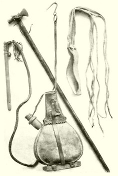 Emléktárgyak Vámbéry Közép ázsiai utazásából. A kamcsi. – A fokos. – A kosbág. – A tatár bőrkulacs.