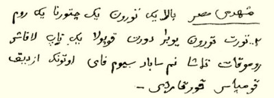 Egy lap Vámbérynak a pusztában arab betűvel, de jórészt magyarul írt feljegyzéseiből. Íratott Karsiban, már visszatérőben Szamarkandból.