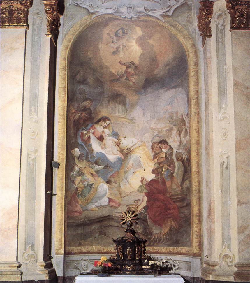 közép-európai késő barokk festészetnek is az egyik legkiemelkedőbb teljesítménye. A művész és segédei a templombelső egészét kifestették: az oltárképek, a mennyezet és az orgonakarzat képei és a díszítőfestés mind freskótechnikával készültek. A belső dekoráció magas fokú egységével egyetlen nagy teológiai gondolatot fejt ki, a megváltás művének folyamatát mutatja be. A ciklus kezdetét az előcsarnokban a pokol tornácán sínylődök jelentik, betetőzését a főoltárfreskó ünnepélyes jelenete, Jézus mennybemenetele, a megváltottak csoportjaitól kísérve. A mellékoltár-képeken és a hajó mennyezetén Krisztus életének jelenetei sorakoznak. A szcénák élénksége, élettelisége éppúgy köszönhető az expresszív formaadásnak és színezésnek, ahogyan a változatos típusoknak és elbeszélőtechnikáknak. A drámai és eksztatikus meseszerű hangulatban keveredik a kedves, zsánerszerű részletekkel.