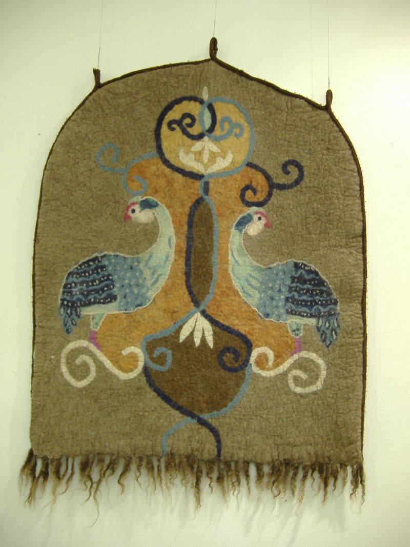Pávás falikép nemezből Készítette Tótáné Pethő Rózsa iparművész.