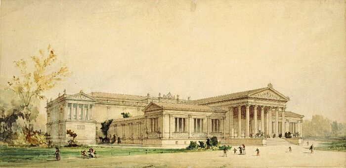 A Millennium évében került napirendre a Szépművészeti Múzeum kérdése, létesítését a 1896 évi VIII. törvénycikk egyik pontja írta elő. 1898-ban írták ki a pályázatot a Szépművészeti Múzeum megtevezésére, amin Schickedanz Albert munkája második lett, mégis ő kapta a tervezési megbízást. Schickedanz hosszan érlelte az épület tervét, mielőtt a kétudvaros, hellenizáló előépítménnyel bővített végső változatot kidolgozta. A múzeum csarnokait különböző stílusban tervezte meg, így volt román, barokk, reneszánsz csarnok is.