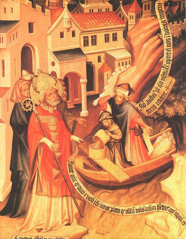 Szent Miklós az éhező városi népet menti meg gabonacsodájával. A három kép a természeti, illetve a városi környezetet a cseh miniatúrafestészetben található megoldásoknak megfelelően ragadja meg. Ugyanekkor nem idegen ez a dijoni udvari udvari művészettől sem.