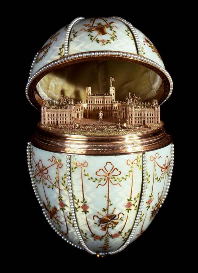 Ezt a tojást II. Miklós az anyjának ajándékozta 1901-ben. Benne a téli cári rezidencia, a Szentpétervár melletti gatcsinai palota miniatűr hasonmása (színjátszó fehér háttér, I.Pál cár szobra, aranytrombita zománcképe)