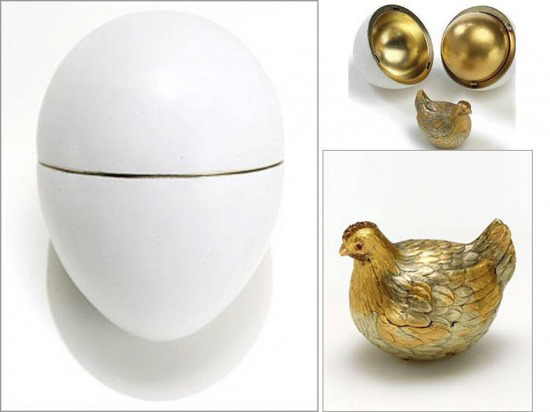 Az utolsó cárok családtagjaikat ékszertojással ajándékozták meg: az elsőt III. Sándor készíttette a feleségének. Fehér zománccal vonták be, hogy igazi tojásra emlékeztessen, s belül a „sárgája” egy kis aranytyúk volt. (fehér külső máz, több színárnyalatú aranyozás, rubinszem)
