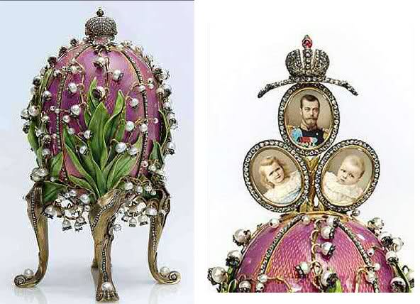 1885 és 1917 között Carl Faberé szentpétervári ékszerész mintegy 50 dísztojást készített a cári udvar megrendelésére. A világhírű Fabergé-tojások zománccal, drágakövekkel, nemesfémekkel voltak díszítve, belsejükbe pedig valamilyen meglepetést rejtett készítőjük: kis aranytárgyat,bonyolult gépezetet, miniatűr festményt. A képen látható, Liliomok Völgye nevű darabot II. Miklós ajándékozta a feleségének 1898-ban. (cári korona csiszolt rubinnal, a cár elefántcsontra festett arcképe, Olga nagyhercegnő – a cár legidősebb lánya, Tatyjana – a második lány, átlátszó zománc – Alexandra cárné kedvenc színe, virág gyöngyből – gyémánt szirmokkal, rokokó stílusú – ún.cabriole bútorlábak)