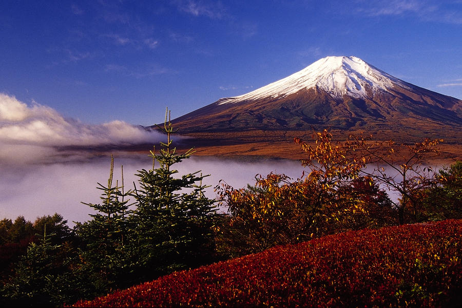 Japán ősi vallása a természeti tárgyakban: hegyekben (képünkön a Fudzsi), fákban, vízesésekben lakó szellemek, a kamik tiszteletén alapul. A 7. században a sintó háttérbe szorult a buddhizmus mellett, de a későbbi császárok visszatértek hozzá, és a sógunátusok idején ismét a legnépszerűbb vallás volt.