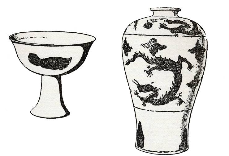Kedvelt porcelánedény formák a Ming-korból: talpas csésze hal motívummal és meiping váza tekeredő sárkánnyal.