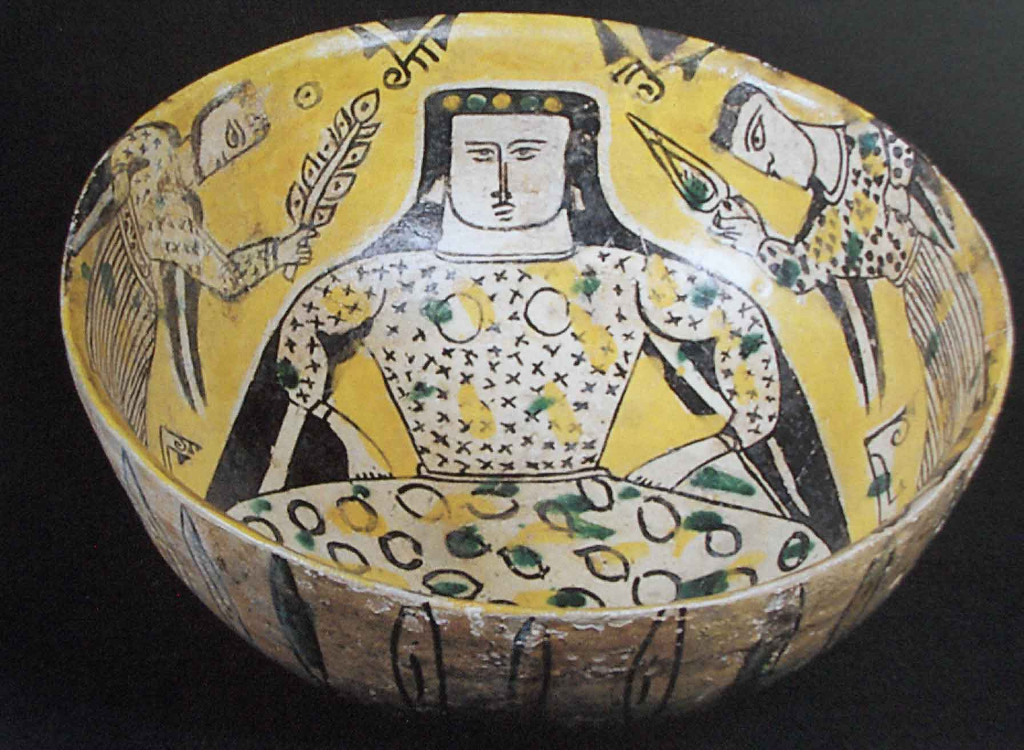 Tipikus szászánida eredetű példa a trónoló alakot és hódolóit ábrázoló edény. Mindhárom alak angyalféle lény, mivel szárnyakkal rendelkeznek; a középsőnek a ruházat alatt megjelenített keblei női mivoltát is hangsúlyozzák. Az öblös tál külső falán egyenlő közönként levélszerű barázdák futnak, amelyek világosan mutatják, hogy a tárgy fémedények felületi struktúráját imitálja.
