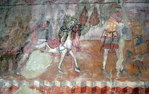 A falfestmények az 1330-as évekre datálhatók. A legendárium képkockái egymás után vonultatják fel a székelyföldi Szent László kultuszra oly jellemző motívumokat: Szent László hadba indul fehér lován, harc a kunokkal a cserhalmi csatában, a váradi püspök leányát elrabló pogány vezér üldözése, közelharc vele, aminek során a leány elvágja a kun lábinát, majd annak lefejezése után Szent László megpihen a leány ölében. E mellett más vallásos tárgyú falfestmények sorakoznak még a templomhajó két oldalán. Így az érdeklődő megismerkedhet Jézus Krisztus vagy Alexandriai Szent Katalin életéből merített jelenetekkel.