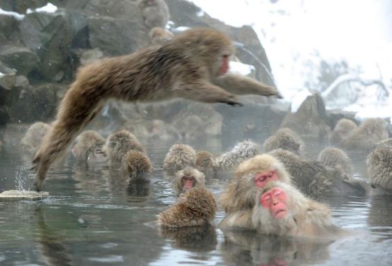Ma már reggelente mintegy 200 makákó merészkedik elő a hegytető bükk- és tölgyerdejéből, s ereszkedik alá a völgy meredek falán a medencéhez, ahol még hógolyóznak is (a parkot négy hónapon át hó borítja). Erre a látványosságra természetesen csak hideg időben számíthatunk. Amikor felmelegszik az idő, a majmok nem járnak ide fürdeni (amíg igen, azt sem tisztálkodás kedvéért teszik – bár például az élelmüket megmossák, ami más majomfajokra nem jellemző). Ez a „műsor” kizárólag Dzsigokudaniban („Pokolvölgy”) látható, melyet azért neveztek el így, mert a telente feltörő gőzoszlopot az emberek eleinte fenyegetőnek vélték.