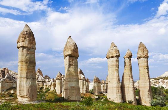 Sehol a világon nincs még egy ehhez fogható tájék: az erózió bizarr formákat vájt ki a tufából, elsősorban a gombára emlékeztető, aranyszín szárú, sötétebb kalappal koronázott úgynevezett mesebeli kéményeket. Ettől a földtani csodától délre és keletre kihunyt tűzhányók találhatók: az Erciyes (3916 m.), illetve a Hasan (3268 m.).