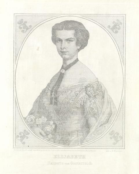 Adolf Mossauer (19. század közepe): Erzsébet királyné portréja, papír, acélmetszet, írásból összeállított „türelmi munka”, 39 x 30,5 cm, Magyar Nemzeti Múzeum, Történelmi Képcsarnok, ltsz.: 56.1214.