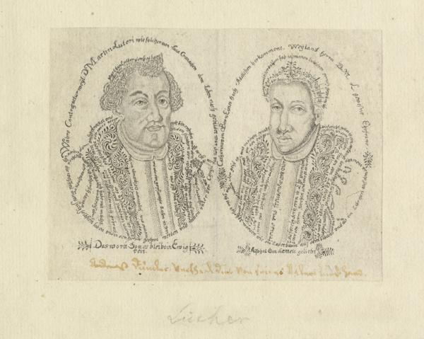 A reformáció témaköréhez kapcsolódik az a kettős arcmás, aminek keletkezési idejét a nyilvántartás a 19. századra helyezte, s amely Luther Mártont és Bóra Katalint jeleníti meg egy-egy medalionban. A figurális és írott elemeket egyaránt tartalmazó képen a medalionok kereteit és a házaspár haját, ruháját német nyelvű gót betűs írás, valamint inda-motívum díszíti. A Luthert körülvevő keret felső részén olvasható szöveg utal arra, hogy a lapra kasírozott, pontozó modorú rézmetszet előképe Lucas Cranach alkotása. Összehasonlítás után azonban felfedezhetünk egy másik, közvetlenebb analógiát is, nevezetesen a nürnbergi metsző és kalligráfus, Johann Michael Püchler (1679–1709) vonatkozó Luther-mikrográfiáját, mely jelenleg a Metropolitan Museumban van, New Yorkban. (További adalék ehhez a gondolatkörhöz, hogy Püchler nagy hatással volt a korszak egyik legkülönlegesebb, kéz- és lábfejek nélkül született polihisztorára, Mathias Buchingerre [1674–1740], aki testi adottságai ellenére egy megfelelő szerkezet segítségével mikrográfiákat is tudott készíteni. De ez egy másik történet.)