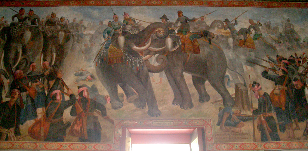 Naresuan és Minchit Sra elefántcsatája falfestményen, Phraya Anusatchitrakon, Wat Suwandararam, Ayutthaya