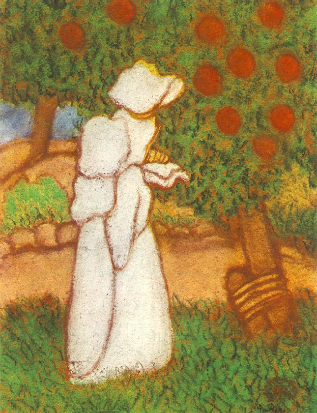 1895 táján Rippl-Rónai skót festőbarátjával közösen egy-egy könyvecske elkészítésén fáradozott. Miután elkészültek Rippl-Rónai litográfiái és Knowles fametszetei, kiadót kerestek, aki aztán szöveget íratott a rajzokhoz, mintegy illusztráltatta azokat. “…A skóté szomorú, az enyém víg; ő a halálra, én pedig az élet iránt nyújtok kedvet; az enyém a nyár, az övé a tél; az én könyvem a világosság, a fiatalság, a nap ragyogása és a szép természet bearanyozása, fiatal lánykák habozása az életük küszöbén, később, és végre amidőn megnyugodva tekintenek vissza múltjukra” – írja egyik levelében. Rippl füzetkéje Les Vierges (Szüzek) címen jelent meg és négy színes grafikai lapot tartalmazott. A kontúrozott síkokból alakított vonalas rajzot 1896-ban az itt látható pasztellban megismételte. (Ez időben vált kedvelt kifejezőeszközévé a pasztelltechnika.) Fehér ruház, lehajló, széles karimájú kalapban sétáló nőalakot látunk, kezében nyitott könyvvel. Zöld fűben lépked, háttérben a fák összefüggő lombja, a lombok közt kerek gyümölcsök piroslanak. A kép középtáján kővel szegélyezet kerti út húzódik végig. A nőalakot vastag kontúrral keretezett egységes fehér foltokból építi fel, a határoló vonalak hullámosan hajladoznak, sehol egy szögletes forma, minden hajlékony, minden lekerekített. A zöld mező és a fák zöld lombja is apró kerek felületek összességéből adódik, a tájképi részleteknél azonban a szecessziós síkszerű vonalritmusába plasztikus elemek is keverednek.