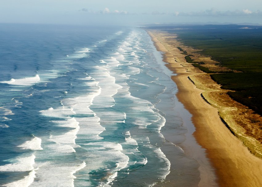 A Ninety-Mile Beach homokos csíkja, amely Ahiparától a Scott Pointig húzódik, 5 km-re délre Cape Maria van Diemen-től délre. Az igazat meg kell mondani, valójában 88 kilométer hosszú. Ez a tengerpart hivatalosan egy autópálya, de valójában csak négykerekű járművekhez alkalmas, és biztonságosan csak az árapályok meghatározott időpontjaiban közlekedhet.