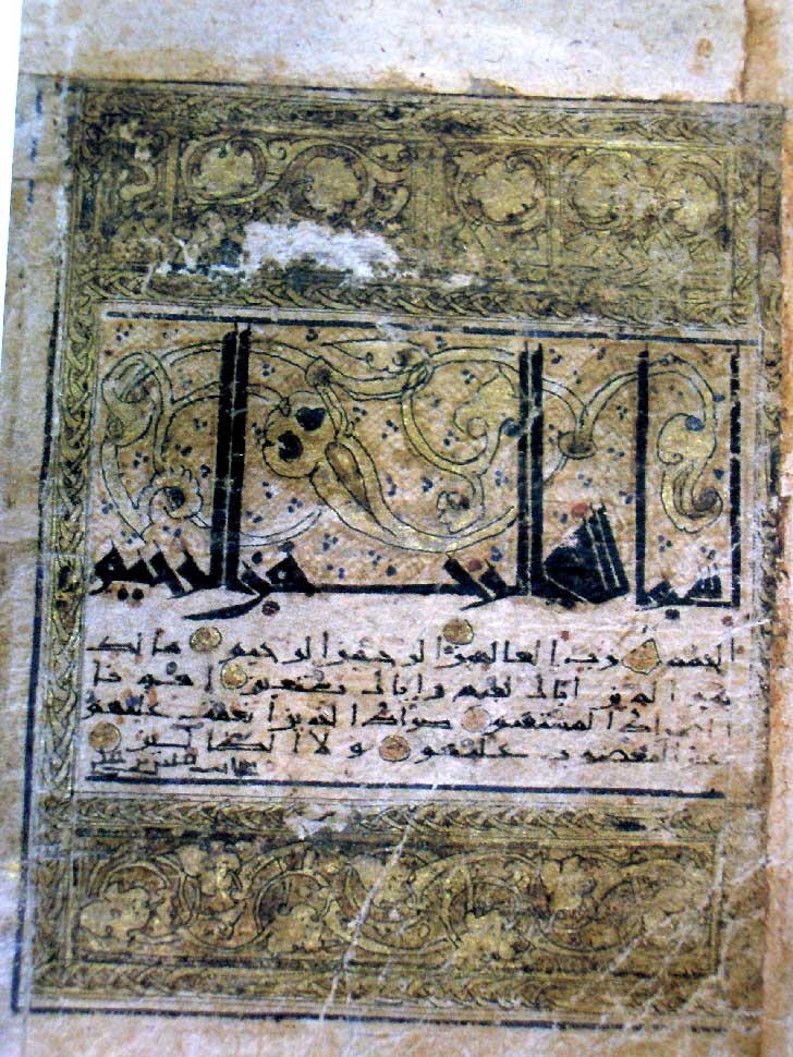 A szöveg változtatási tilalma miatt egyértelmű írásrendszerre volt szükség. Mohamed idejében mind kurzív, mind szögletes arab írásmódok használatban voltak. Szent szöveg esetében csak az utóbbi – az ún. máil vagy hidzsázi írás – jöhetett szóba. Ebből fejlődött ki több más írással együtt a híres kúfi stílus, amely Kúfa iraki városhoz kapcsolódik, noha csupán a hidzsázi egyik változata. Hosszadalmas folyamat volt, amíg az írás a beszélt nyelvhez igazodott: jelölni tudta a rövid magánhangzókat, a kettőshangzókat, stb.. A fenti példán a kisebb vörös pontok magánhangzókat fejeznek ki, az aranyozott nagyobbak a szöveget tagolják (kép).
