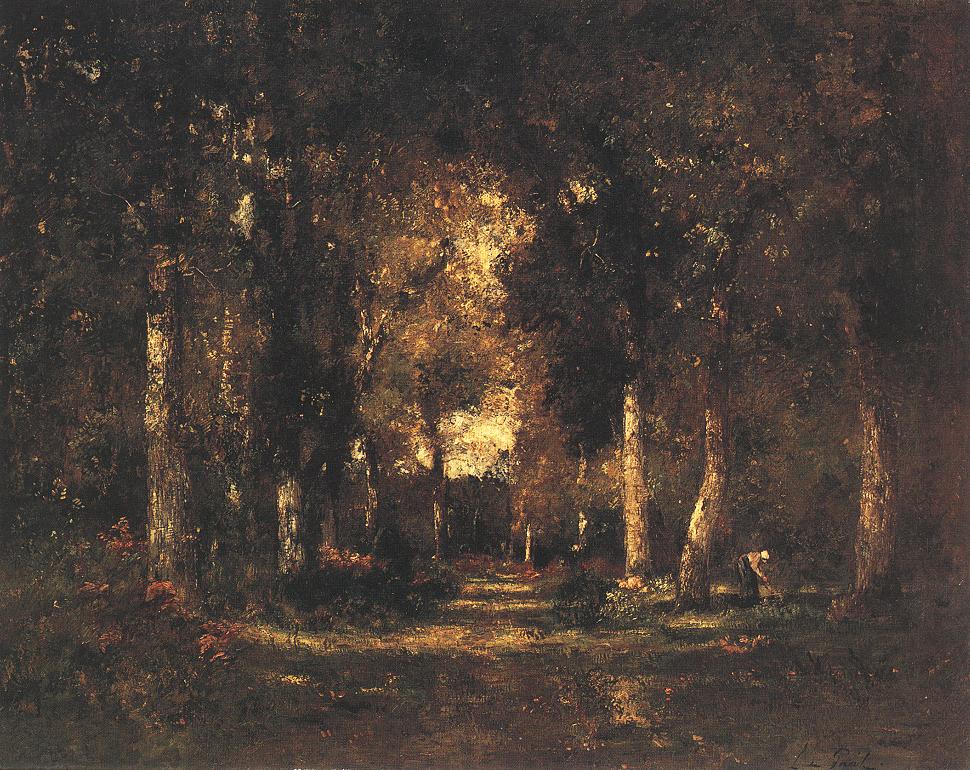 Paál László képei többnyire tájképek, amelyeken emberi alak alig fordul elő. Ez a kép a ritkábbik típusba tartozik, egy kapáló nő látható az előtérben. A táj és az emberi lények együttesében Paál Lászlónál mindig a táj kap fontosságot. A dolgozó nő itt is majdnem eltűnik a fák között, nem zavarja jelenléte az erdő csendjét és nyugalmát. Az őszi napsugarak behatolnak az erdő mélyébe és fénycsíkokat vetnek az erdei útra.