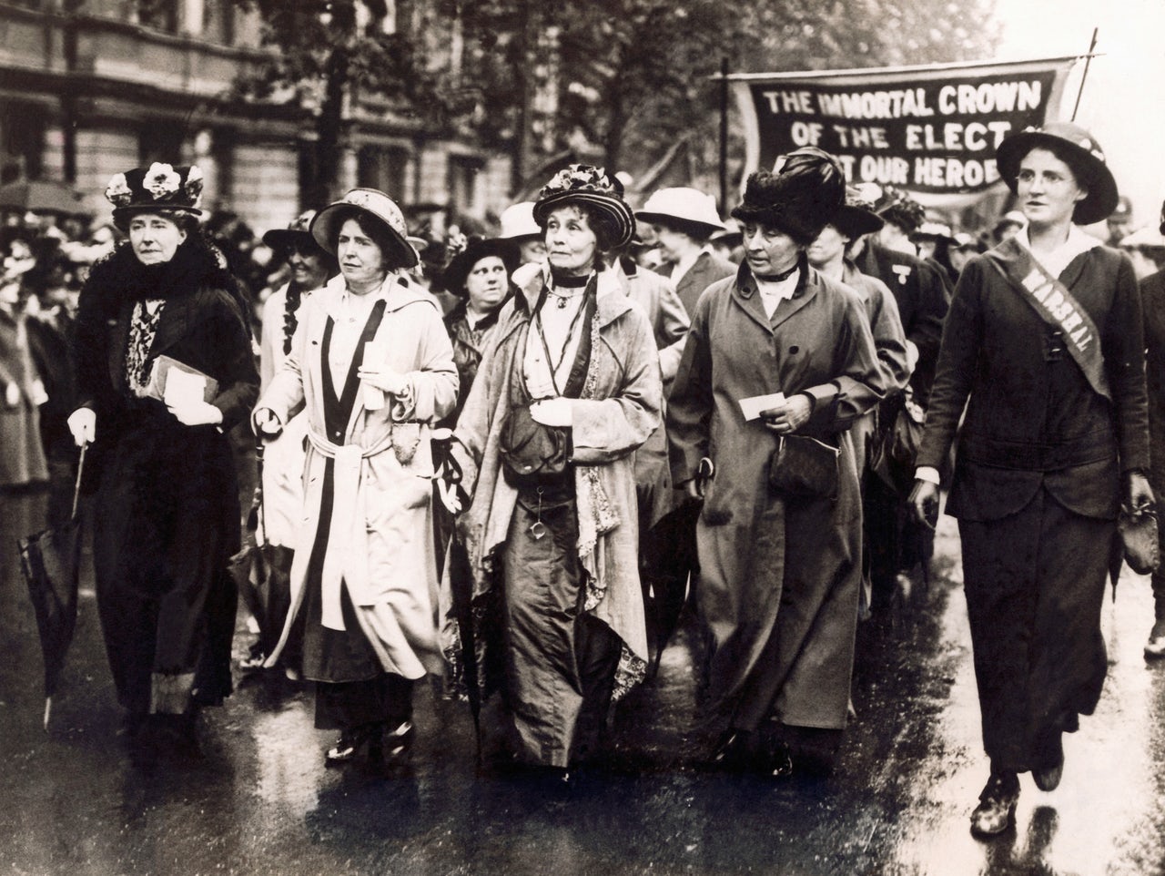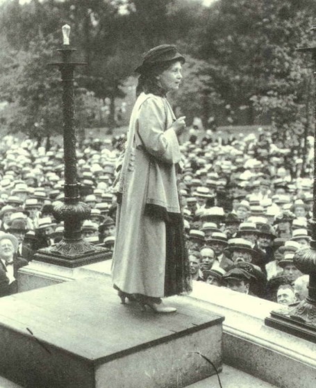 Emmeline a szüfrazsettek élén menetel. Az általa alapított Társadalmi és Politikai Nőegylethez munkásasszonyok éppúgy csatlakoztak, mint London előkelő dámái, ami nagyban segítette a mozgalom sikerét.