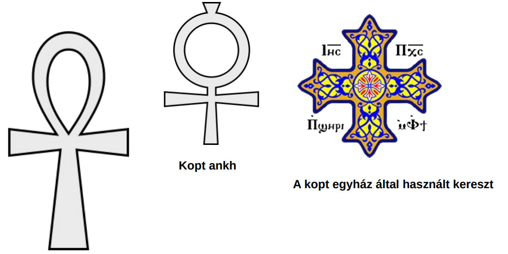 Egyiptomi kereszt, ankh. Eredeti jelentése nem ismert, Óegyiptom egyik legfontosabb jelképe, Ozirisz és Ízisz szimbólumát egyesíti, a Föld és az Ég egységét jelképezi, kulcsként nyitja az élet és halál kapuját, a halállal szemben védelmet jelentő jelkép; számos istenség kezében a hatalom, a halhatatlanság, az életadó víz és a levegő jelképe.