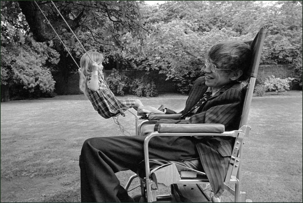 Hawking hintázó kislányával, Lucyval 1977-ben, cambridge-i kertjükben. A gyermekből később írónő lett, aki többek között apja elméleteit írta meg leegyszerűsítve gyermekek számára. | © Ian Berry / Magnum Fotó