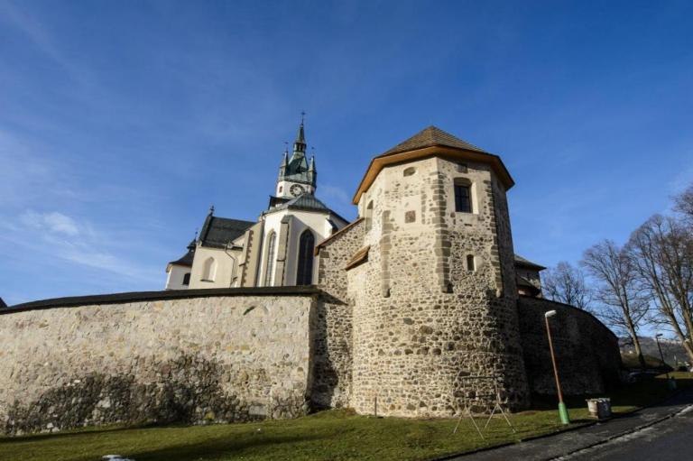 Körmöcbánya, 2017. december 26.A Szent Katalin plébániatemplom és az egykori várfal a felvidéki Körmöcbányán 2017. december 25-én.MTI Fotó: Komka Péter | A pénzverde épülete