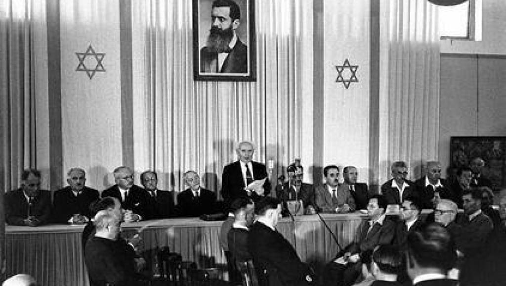 Ben Gurion 1948. május 14-én először olvassa fel a Tel Aviv-i Múzeumban (ma a Függetlenség Csarnoka) Izrael állam függetlenségi nyilatkozatát a cionista eszme atyjának, Theodor Herzlnek a képe alatt.