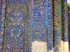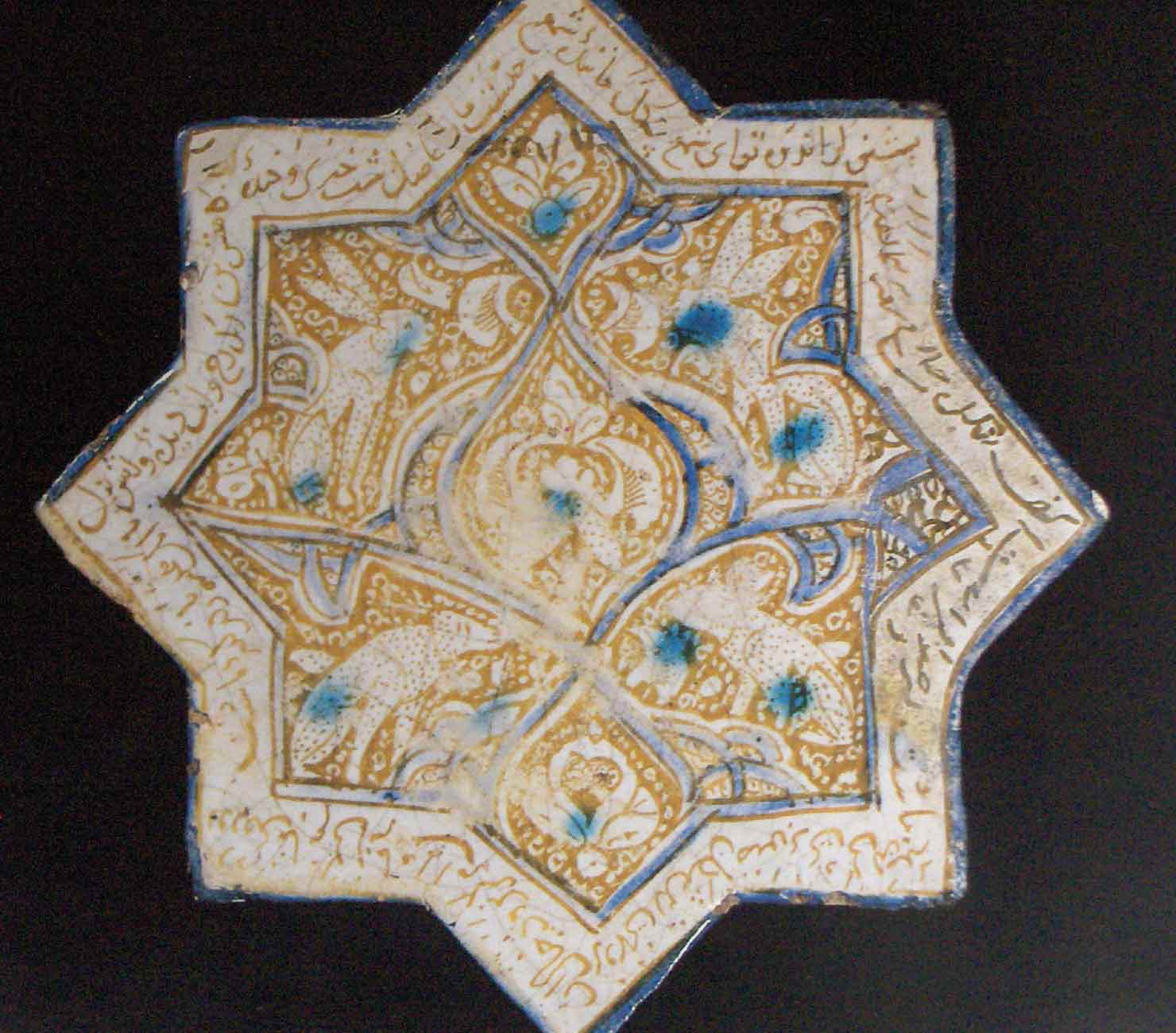 Mecsetek, paloták, mauzóleumok kedvelt iráni díszítőmegoldása a színes, mázas csempe. Formai és technikai szempontból rendkívül változatosak, mégis nagyon sokban hozzájárulnak a keleti iszlám területek egységes építészeti képéhez. Számarrá kezdeti fölénye után a 12. századtól a legszebb máztechnika, a lüszter előállításában közép-Irán, azon belül is Rajj, és leginkább Kásán játszotta a vezető szerepet, olyannyira, hogy a csempe elnevezését – kásí – is e város kölcsönözte a perzsa nyelvnek. A ragyogó fényű, drága és rendkívüli szaktudást igénylő lüszteres csempedísz számos válfaja közül kettőt mutatunk be. Az egyik a nyolcágú csillagcsempe, amely kereszt alakú kötőformával kapcsolva elvileg végtelen felület befedésére alkalmas. A Kásánban tökélyre fejlesztett kőpaszta terméket nagy távolságokra exportálták, és még Anatóliában is imitálták. Jellemző színe a fehér alap, a kobaltkék és az aranysárga. 1281-re keltezett példánk szinte teljes felületét beborítja a díszítés: középen kék palmettával osztott mezőkben virágok, nyulak és pettyezett háttér, a kereten a mulandóságra figyelmeztető négysoros vers (rubá’í), Samsz ad-Dín Tabaszí műve található (1. kép).