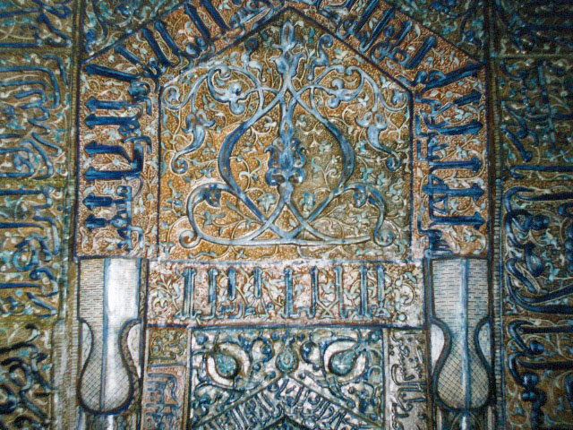 A másik jellegzetes kásáni dekoráció a fénymázas mihráb. Ez nagyobb darabokból tevődik össze, és – a csillagcsempével ellentétben – díszítésében nagy szerepe van a relief-technikának is. Túlnyomórészt síita központok díszítéséhez használták e mihrábokat; Kásán mellett (Maszdzsid-i Majdán) a típus legszebb példái Qum (2. kép) egyik mauzóleumából, a mashadi Rizá imám-szentélyből, és a gurgáni ún. Imámzáda Kárangíból származnak. A domborműves kalligráfia, az alattuk kanyargó indadísz és az egészet beborító lüsztermáz olyan fényűzően gazdag egységet alkot, mint talán sehol másutt a középkori iszlám kerámiaművességben. A későbbi csempék ezért nem is ezt az irányzatot folytatták, hanem a kiégetett mázas kerámiaanyag formára vágásával, majd utólagos összeillesztésével megteremtették a csempemozaik műfaját, amelynek kezdeti, anatóliai fázisa után a Timuridák és a Szafavidák alatt jött el az aranykora (3. kép).