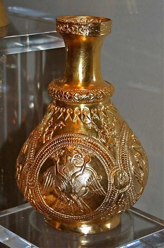 A nagyszentmiklósi kincs 2. korsó két részlete: balra az „égi vadászat”, jobbra pedig a sztyeppe vidék különböző termékenység-hiedelmeivel kapcsolatba hozható „égberagadási jelenet”