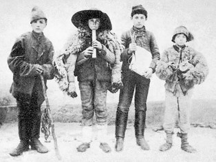 Felvidéki regösök a század elejéről, jellegzetes hangszereikkel. A regősének refrénjében fennmaradtak a régi sámánok szellemhívó varázsszavai. (Budapest, Néprajzi Múzeum)