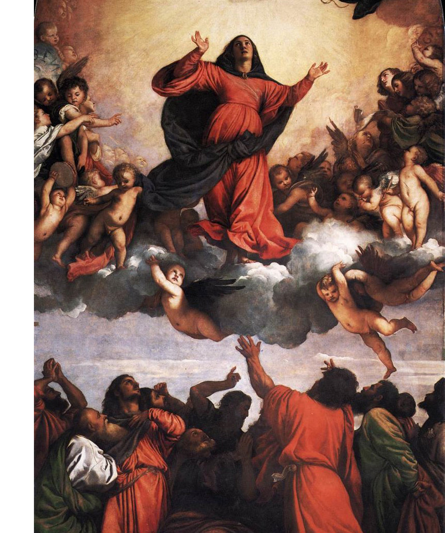 A festmény szinte azonos a velencei Basilica di Santa Maria Gloriosa (Dicsőséges Szűz Mária temploma) oltárképével, amelyet Tiziano festett. Ez szolgálhatott mintául Grigolettinak. Bár az 1548-ban készített kép „csak” 6,9 x 3,8 méter.