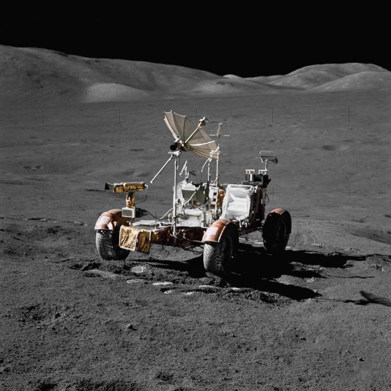 A Lunar Roving Vehicle (LRV) kidolgozásánál figyelembe kellett venni a -160 és +125 fok közti hőingadozást, ezért a kerekeket titánacélból tervezték. A 3 m hosszú, 2 m széles kocsit összehajtva helyezték el a holdkomp alján, súlya 200 kg volt. A jármű a Holdon kifordult a kompból, rugók kitolták az alváz meghosszabbítását, majd kihajtották a kerekeit, melyek eredetileg 45 fokban behajtva helyezkedtek el. Az egész „kicsomagolás” 15 percig tartott.
