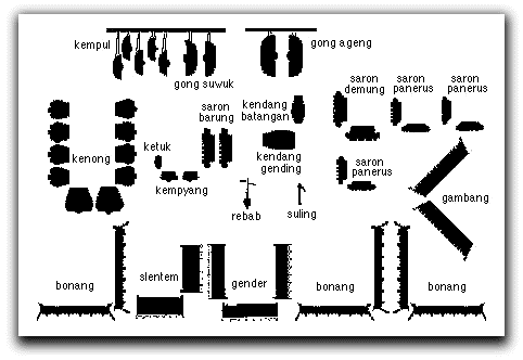 Gamelán: ezt az igen bonyolult ritmusú és dallamú indonéz zenét főként ütőhangszerekkel játsszák: gonggal, dobbal, metallo- és xilofonnal. |A gamelán-zenekar összetétele: ebben a zenekarban sokféle hangszeren játszanak. Rajzunk az egyes zenészek hagyományos elhelyezkedését mutatja. A leghangosabbak vannak hátul, a halkabbak közelebb a hallgatósághoz. A ritmust a középen ülő dobos diktálja.