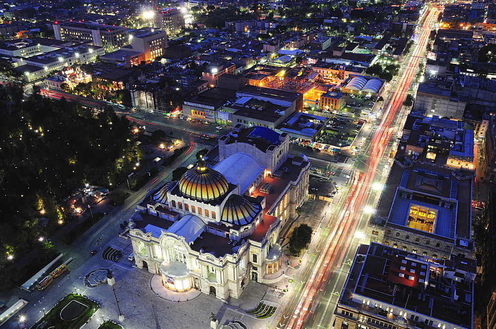 Mexikóváros éjszaka; előtérben a díszes „Szépművészetek Palotája”.
