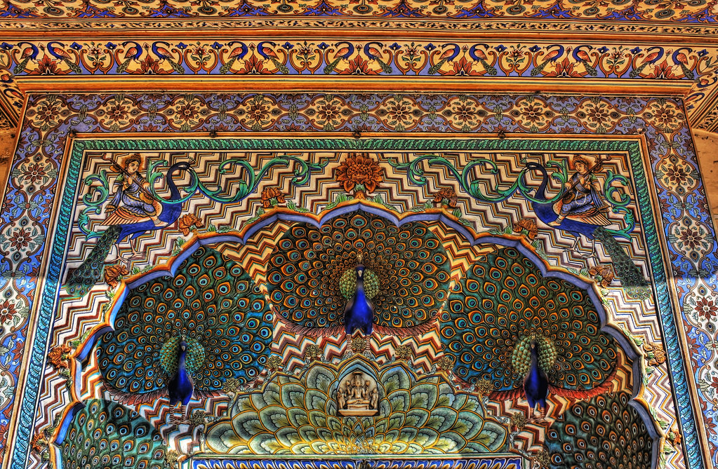 Kék pávák koronázzák a jaipuri városháza palotájának bejáratát. Az indiaiak számára a pávák jelképezik a napot és a csillagos égboltot.