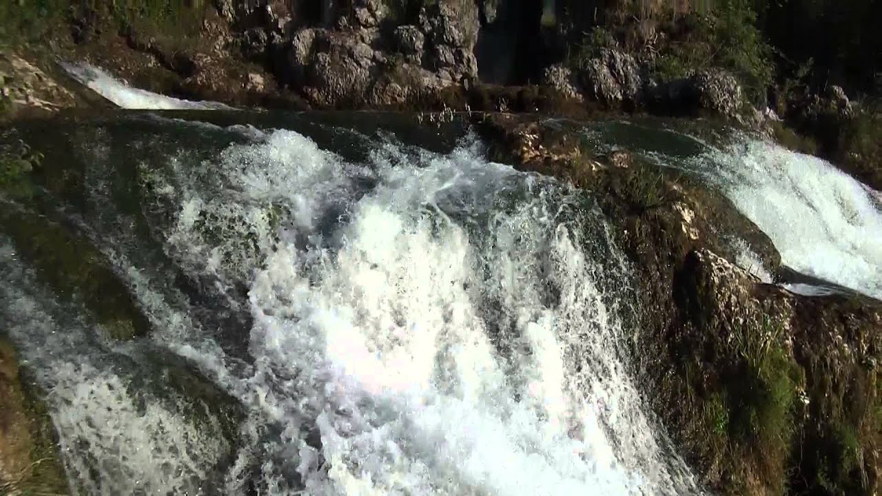 A természet színjátéka: a Rajna vízesés Schaffhausennél. A 150 méter széles Jura-mészkőlépcsőtől tajtékozva, dübörögve zúdul le a Rajna vize a 21 méteres mélységbe.